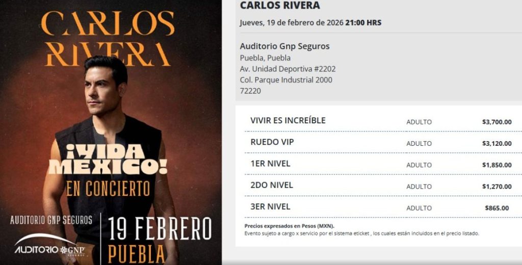 🎟️ Precios de los boletos para Carlos Rivera en Puebla