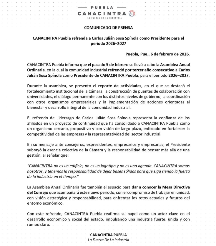 Durante la Asamblea Anual Ordinaria celebrada el pasado 5 de febrero, Sosa Spínola fue refrendado por tercer año consecutivo como Presidente de CANACINTRA Puebla para el periodo 2026–2027, el que será su último año.