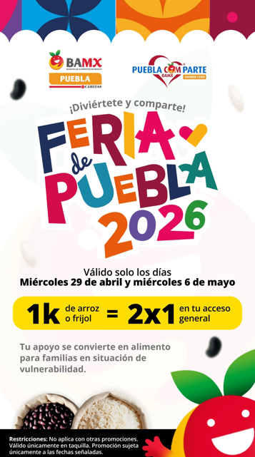 Como parte de esta iniciativa, las personas que lleven 1 kilo de arroz o frijol podrán obtener una promoción de 2×1 en acceso general a la Feria de Puebla 2026.